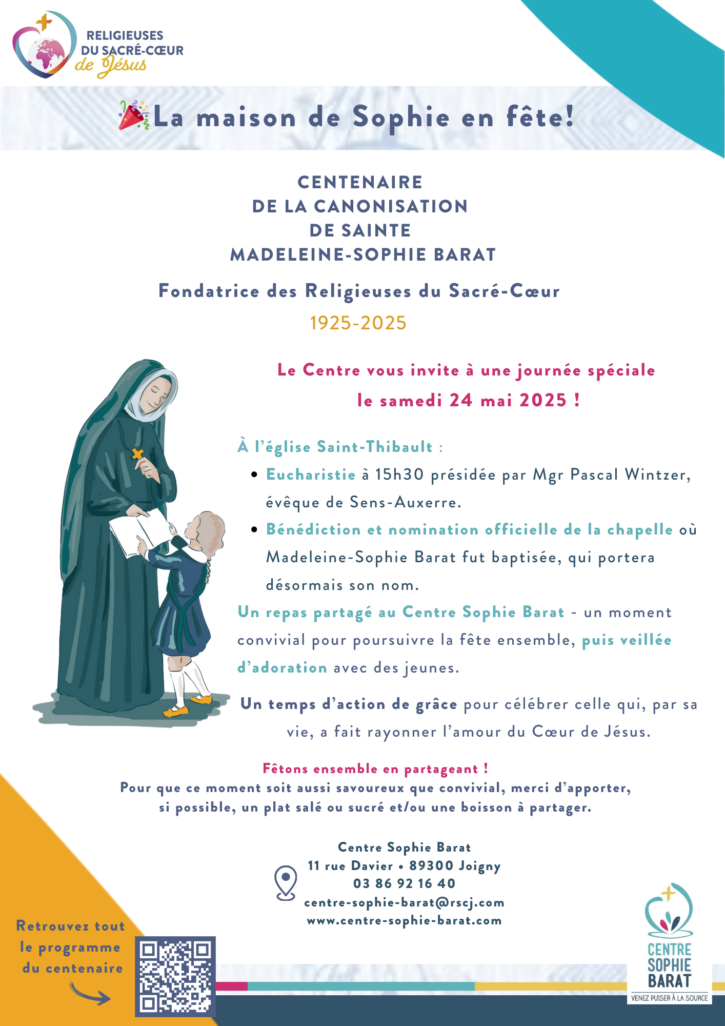 - International webinar on Saturday, October 18th, 2025: Julien Béchard, archivist and professor/researcher, presented a conference on the spirituality of the Sacred Heart of Madeleine Sophie. It was followed by testimonies from two sisters of the Sacred Heart in Spain and Asia on how they live out the spirituality of the Sacred Heart inherited from Madeleine Sophie in their missions. Watch the video