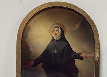 ¿Qué nos podría decir esta pintura? Dos hojas de roble blanco que ayudan a crecer a una hoja de roble rojo pueden significar que Filipina nos protege y bendice, sostiene nuestras aventuras mientras exploramos nuevas y diferentes fronteras. Las “nuevas fronteras” de hoy pueden ser muy diferentes de lo que eran para Filipina. Se nos invita a mantenernos abiertas a la escucha cuando las nuevas fronteras nos llamen. A algunas de nosotras nos pueden llamar a marchar lejos, pero las nuevas fronteras pueden aparecer también donde estamos, invitándonos a ir hacia nuevas periferias «para acompañar la vida que brota, defender la justicia, la paz y la integridad de la creación, en respuesta a todos los que buscan sentido a su vida, los que han sido heridos, desplazados y excluidos por la pobreza, la violencia y la degradación ambiental». En la pintura, Santa Filipina Duchesne está diciendo: “tengan coraje, tengan fe”. Esta mujer santa que era conocida por los Potawatomi como “la mujer que siempre reza”, reza con nosotras ahora que enfrentamos y respondemos a los desafíos de nuestro tiempo.