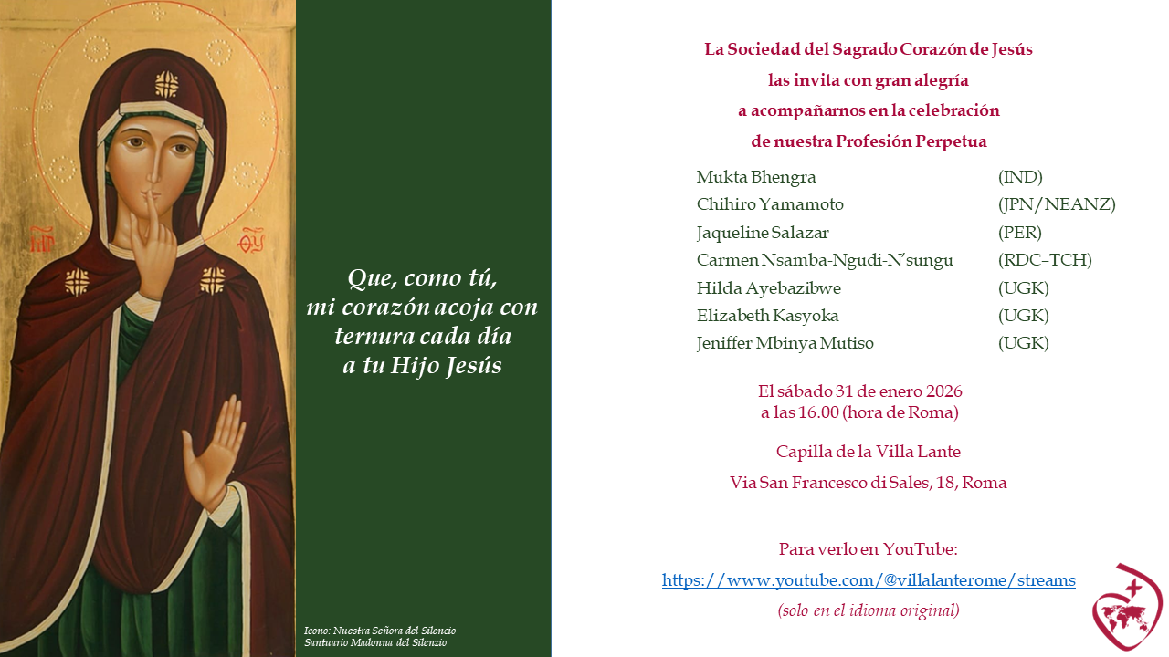 Con inmensa alegría, la Sociedad del Sagrado Corazón de Jesús les invita a celebrar con las probanistas de la Sociedad la profesión perpetua el 31 de enero de 2026.