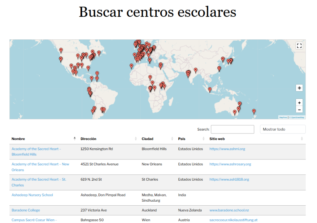 La sección Educación del sitio web de RSCJ International se ha actualizado con un mapa y una base de datos de escuelas de todo el mundo. Ahora pueden buscar escuelas del Sagrado Corazón en todo el mundo en un mapa o accediendo a la lista de escuelas y buscando por nombre, lugar, ciudad, tipo de escuela u otras palabras clave. Al hacer clic en la escuela, aparecerán sus direcciones, sitios web e información de contacto. De esta manera, podrán encontrar fácilmente el tipo de escuela que buscan en su ciudad o país.