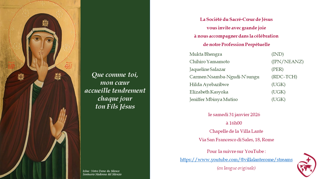 C’est avec une immense joie que la Société du Sacré-Cœur de Jésus vous invite à être avec les probanistes de la Société dans leur célébration de la profession perpétuelle le 31 janvier 2026.