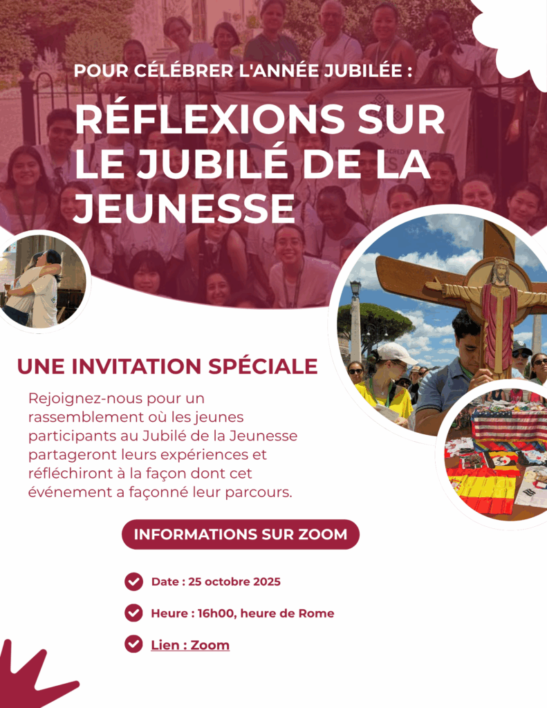 Lors de cette rencontre, les jeunes participants au Jubilé des Jeunes partageront leurs expériences, leurs apprentissages et les chemins transformés par cet événement. Ce sera une occasion d’écouter leurs voix, de célébrer leur engagement et de réfléchir ensemble à l’impact du Jubilé dans leurs vies et leurs communautés.